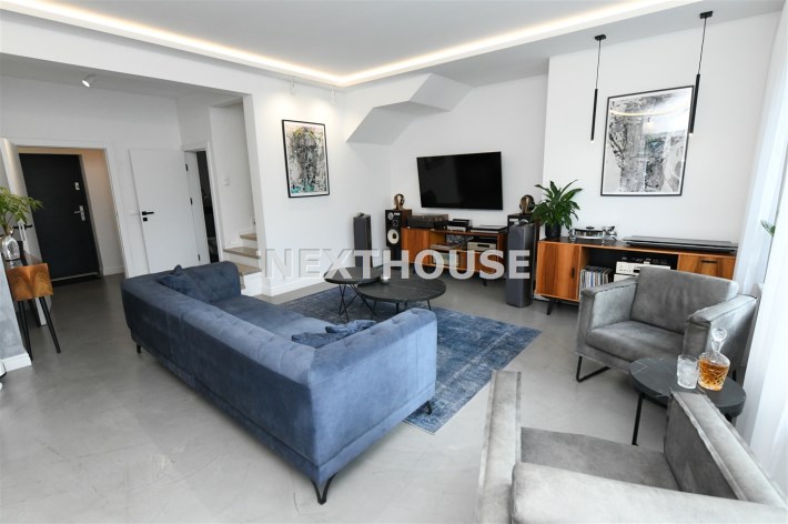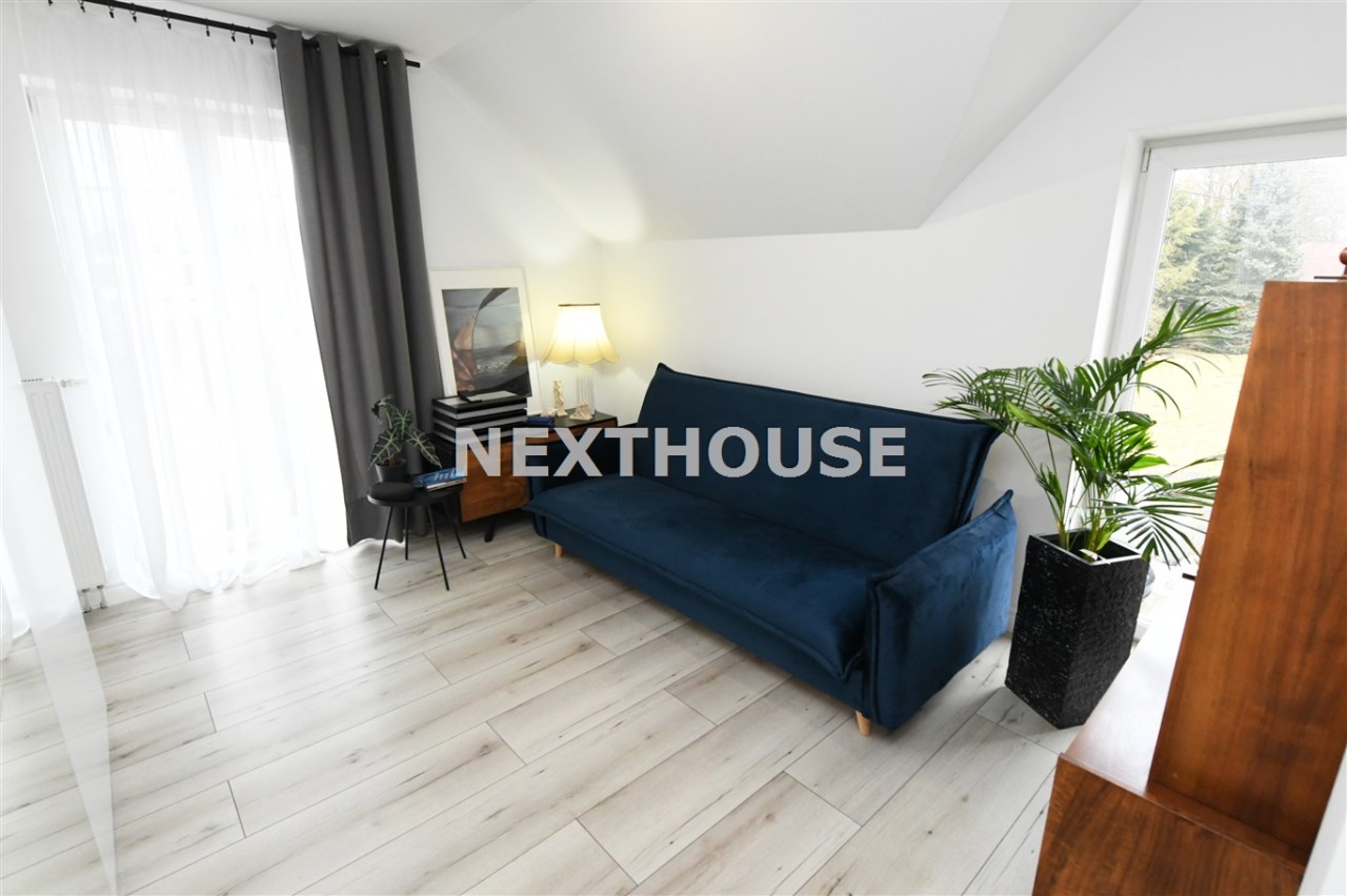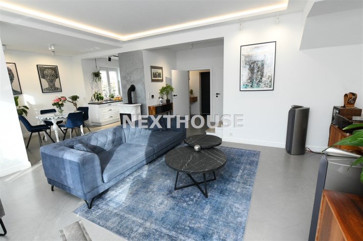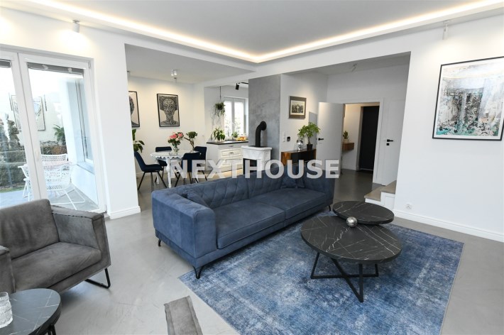 Dom został zbudowany z myślą o komforcie i wygodzie. Na parterze znajduje się przestronny salon z kominkiem, połączony z aneksem kuchennym i wydzieloną kuchnią z pełną zabudową AGD. Bezpośrednie wyjście do zadbanego ogrodu pozwala cieszyć się chwilami na świeżym powietrzu. Na tym poziomie znajduje się także wiatrołap,WC oraz garaż o powierzchni 19,5 m².