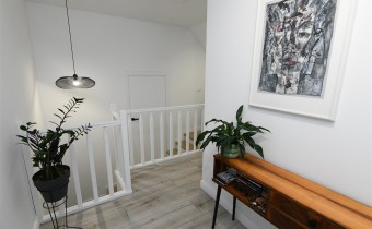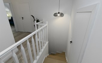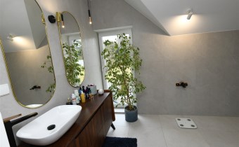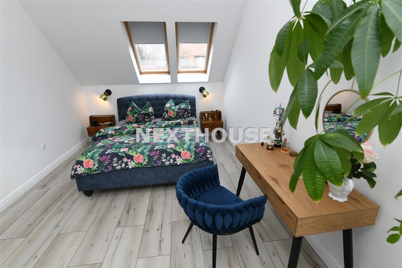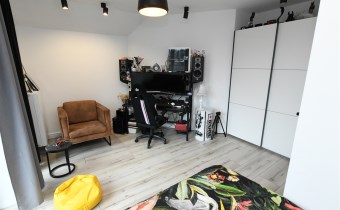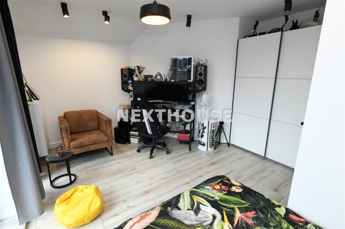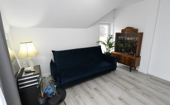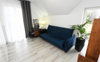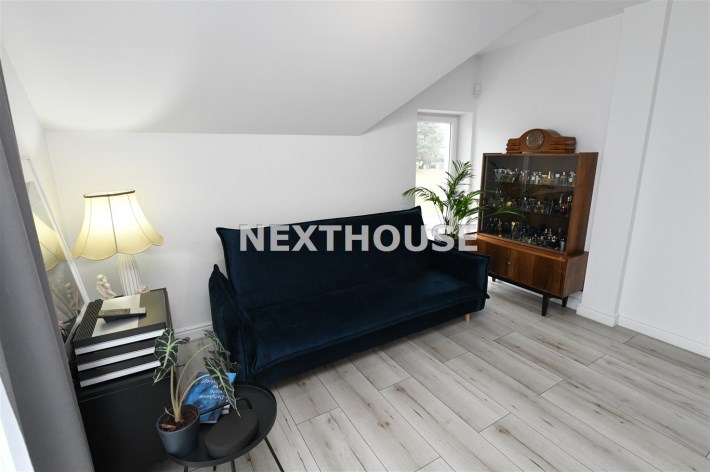 Na piętrze domu znajdziesz sypialnię, dwa dodatkowe pokoje, z których jeden posiada dużą, funkcjonalną garderobę oraz balkon. Duża łazienka na piętrze sprawia, że nawet większa rodzina znajdzie tu swój komfort.