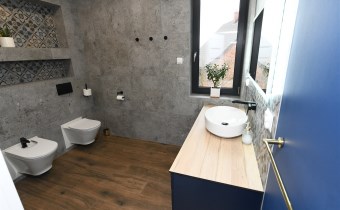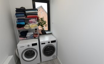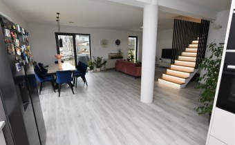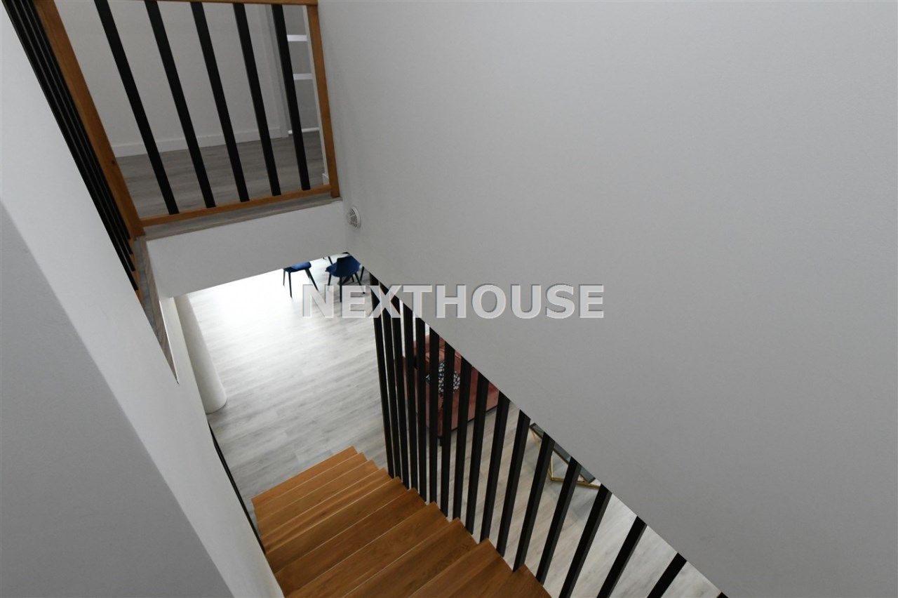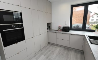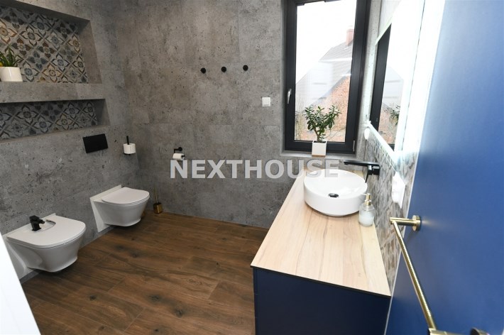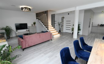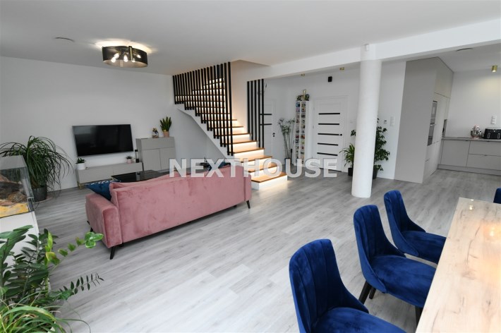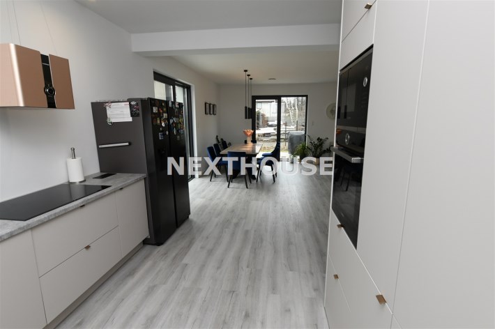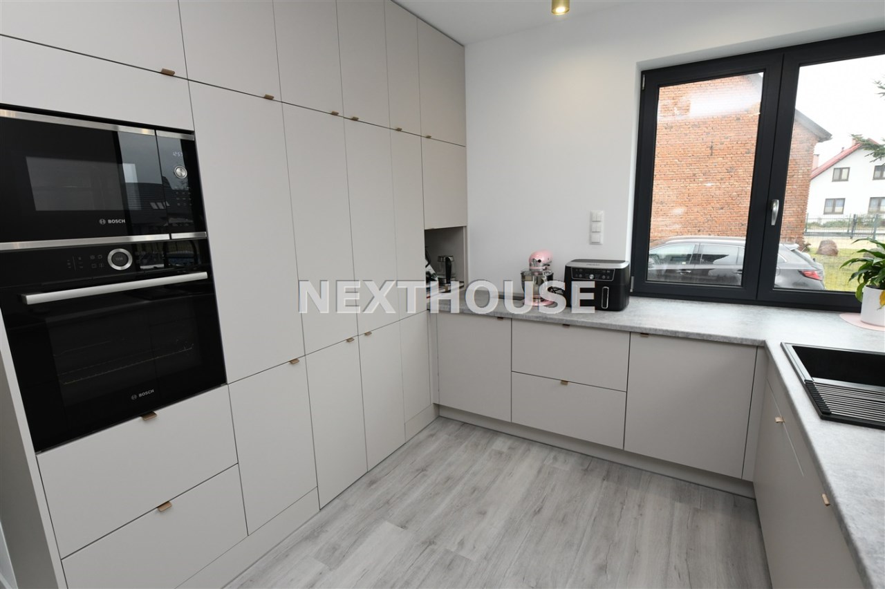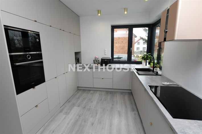 Na parterze tego funkcjonalnego,nowoczesnego bliźniaka z 2023 r./elementem wspólnym jest jedynie garaż/ znajdziesz przestronny salon z bezpośrednim wyjściem do ogrodu oraz nowoczesną kuchnię/z osobną spiżarnią/, wyposażoną w sprzęt AGD marki Bosch. Dodatkowo, na parterze znajduje się WC, wiatrołap oraz dwustanowiskowy garaż z automatyczną bramą "Krajewski", a także kotłownia z dwu-funkcyjnym bardzo ekonomicznym kotłem Brotje.