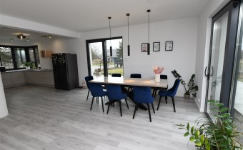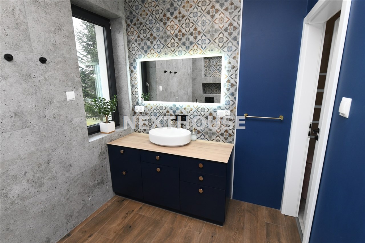 Dom wyróżnia się nowoczesnymi rozwiązaniami, takimi jak rekuperacja i ogrzewanie podłogowe/panele winylowe i gres na podłogach/ z osobnymi regulatorami temperatury w każdym pokoju.Wyprowadzone zostały instalacje pod klimatyzację oraz światłowód. Alarm,automatycznie sterowane rolety /parter i piętro/ oraz inteligentny system Smart, pozwalają na pełną kontrolę nad mediami i roletami, z możliwością dalszej rozbudowy. Na terenie ogrodu znajdują się dwa zbiorniki na deszczówkę, co wspiera ekologiczne podejście do zarządzania i magazynowania wodą.