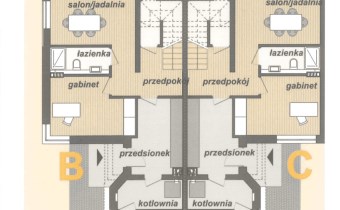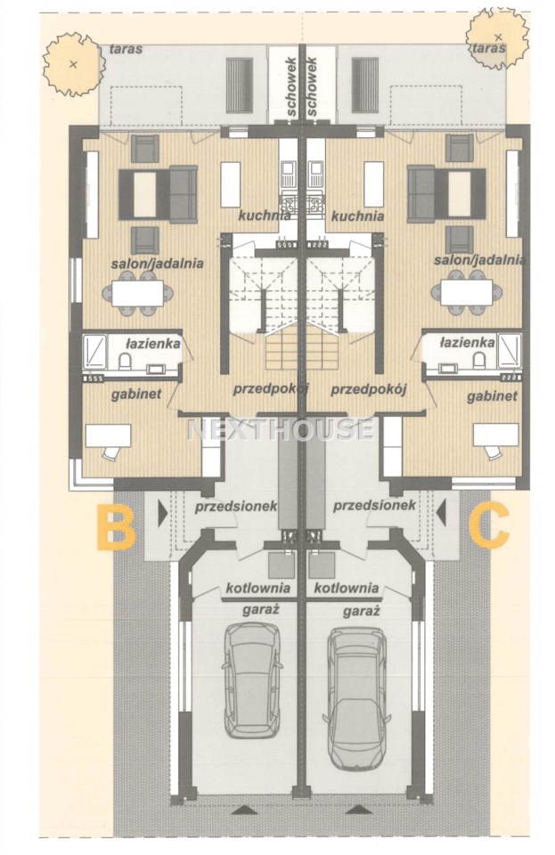 Parter: jasny salon z kuchnią i wyjściem na taras, miejsce na kominek, dodatkowy pokój (gabinet/sypialnia), łazienka oraz praktyczna przestrzeń na spiżarnię.