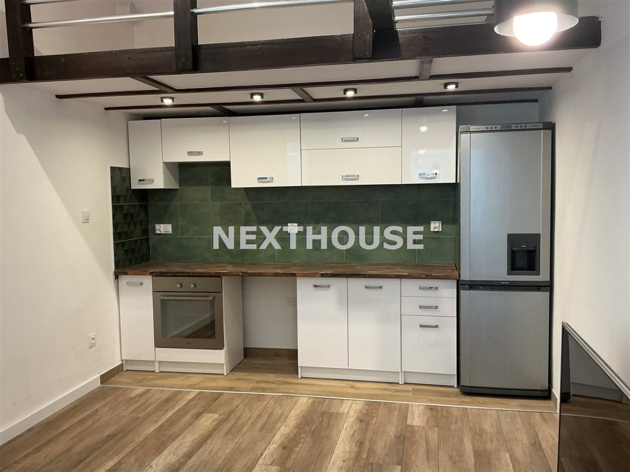 kuchnia w zabudowie z AGD (piekarnik, płyta indukcyjna, lodówka, pralka),