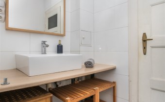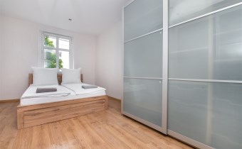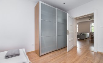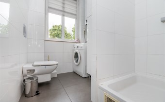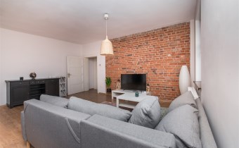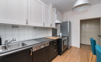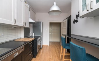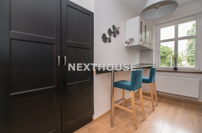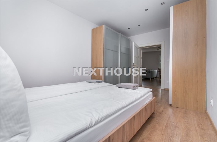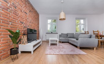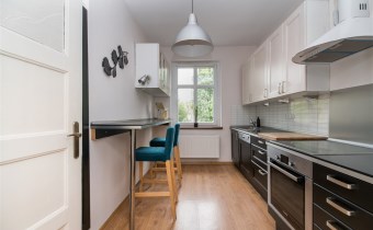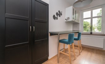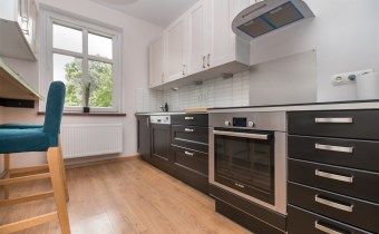2 składa się z dużego pokoju wyposażonego w sofę, witrynkę, komodę, stolik i stół z krzesłami oraz TV, dostęp do internetu. Drugi pokój to sypialnia wyposażona w podwójne łóżko, szafki nocne i 2 duże szafy. Kuchnia w zabudowie wraz ze sprzętem AGD (lodówka, zmywarka, płyta indukcyjna, piekarnik, automat do zaparzania kawy). W łazience umywalka, kabina prysznicowa, wc i pralka oraz kocioł gazowy dwufunkcyjny Firmy Vailant. Na przedpokoju znajduje się duża szafa i górne półki. W budynku domofon, dwa wejścia: jedno od ul. Hutniczej drugie od strony podwórka, gdzie znajdują się miejsca parkingowe.